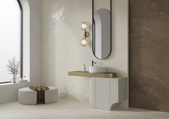 Коллекция основана на эстетике натурального травертина Rapolano, известного своими утонченными, нерегулярными узорами и естественной игрой света. Плитка доступна в форматах: 598x1198 мм и 1198x1198 мм, с поверхностью, отделанной матовой глазурью с сатиновой структурой, очень приятной на ощупь. Все это обогащают нежные, блестящие декоративные эффекты, которые добавляют элегантности и вносят в интерьер природную легкость.
