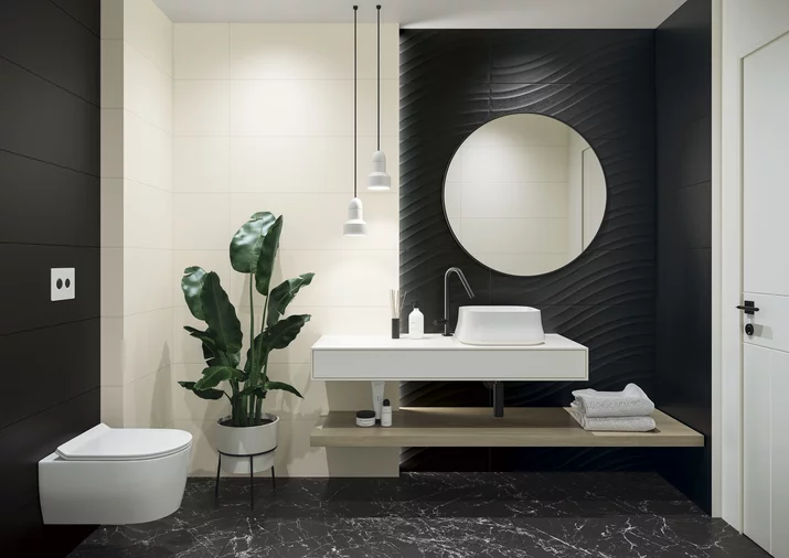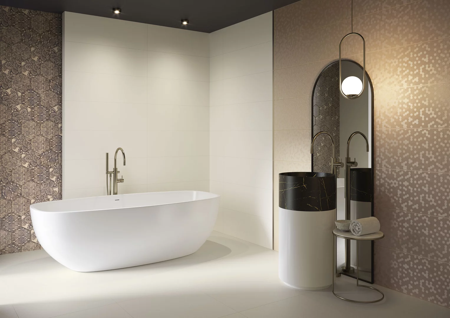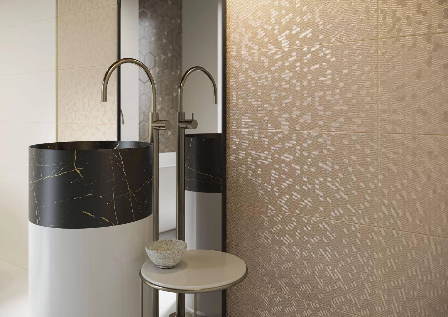 Odvážne zlaté vzory v kombinácii s výraznými hexagonálnymi ornamentmi dajú miestnosti vkus typický pre francúzske domy. Šperkové prvky kombinované s dlaždicami v nadčasových čiernych a bielych farbách. Vďaka tomu môžete svojmu dizajnu dať neopakovateľný štýl, ktorý nadlho zostane módny.