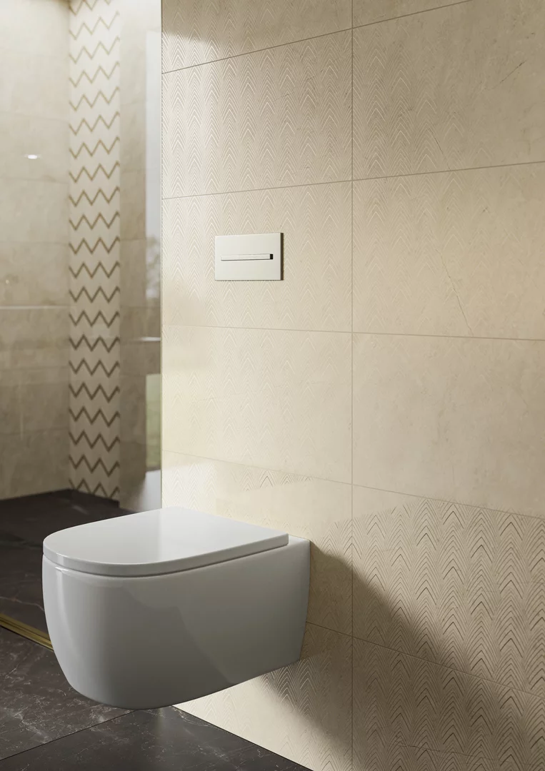 Zlaté ornamenty a symetrické vzory z kolekcie SUNRISE sa snúbia s nadčasovou krásou kameňa, vytvárajúc atmosféru jemnej rafinovanosti. V spoločnosti jemných béžových odtieňov nadobúda celok teplý efekt rozvidnievania rannej oblohy.